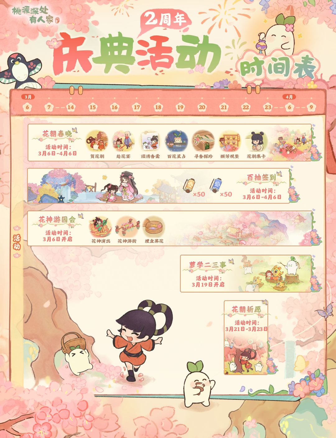 各位萝萝山的山民们好呀!花朝盛典已开启,桃源二周年庆也正式拉开帷幕!小花贴心整理了一份二周年庆活动时间表,一张图帮山民理清周年庆版本的日程规划! 桃源周年庆之际,正是一年迎春赏花之时。萝萝山将展开丰富多彩的花朝节周年庆主题活动,不仅签到领一百卷轴,更有花朝祈愿抽奖活动! 收藏日历,不错过每一个精彩环节!山民最期待参与哪项活动呢?快来评论区告诉小花吧~#桃源深处有人家
