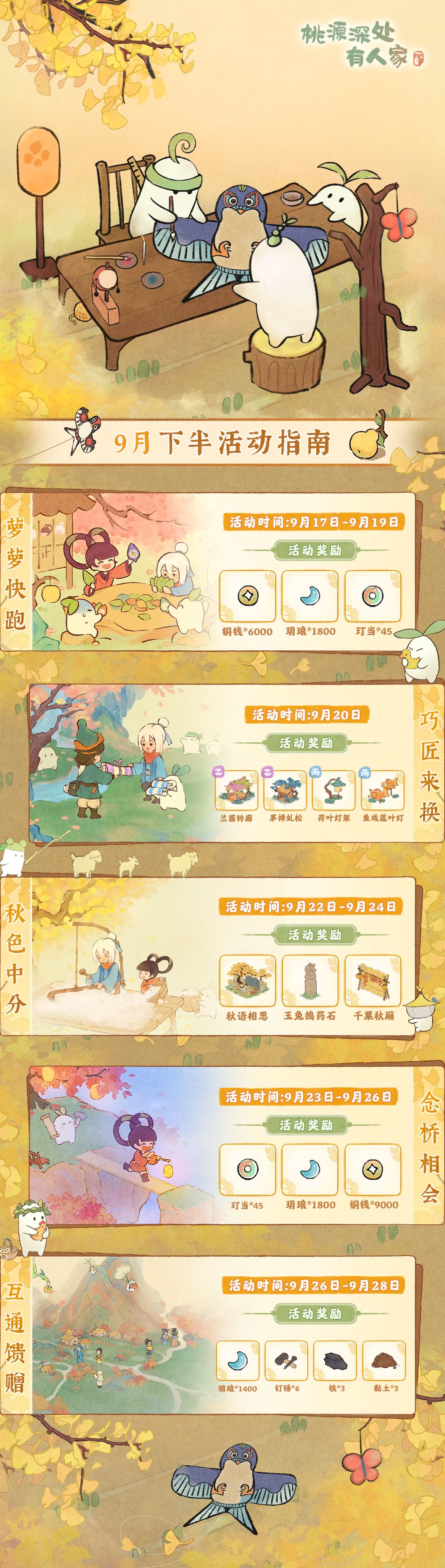 六月火云散,蝉声鸣树梢。 各位萝萝山山民好呀!五月芳菲未尽,六月蝉鸣已起,端午佳节也到啦~不知山民们是否已尝过粽子?小花今日给大家带来了六月上半月的活动日历,山民们可以收藏日历防止错过活动时间萝! 萝萝提示:「巧匠来换」活动周期为 35 天,新一期轮换将于 6 月 15 日开启,山民记得留意时间规划哦~ #桃源深处有人家