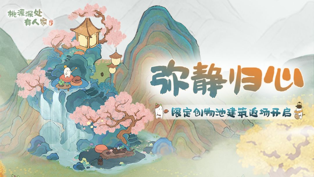 山中有禅清净在,瑶花缘木意归心。 山民们期待的限时UP建筑创物池「弥静归心」将在11月7日上午10点开启返场萝!山民们可千万不要错过萝~ 山民们可以在「弥静归心」主题创物池中获得「水云静栖」主题系列建筑,获取后可以在瑶花瀑布旁打坐修行,轻敲木鱼,听夏夜蝉鸣,聆山间细雨。 此外还有乙等建筑「春涧落花」、丙等建筑「浮月松」、「碧幽潭」。 一起来装扮一个充满禅意的萝萝山吧~ #桃源深处有人家 #桃源玉成