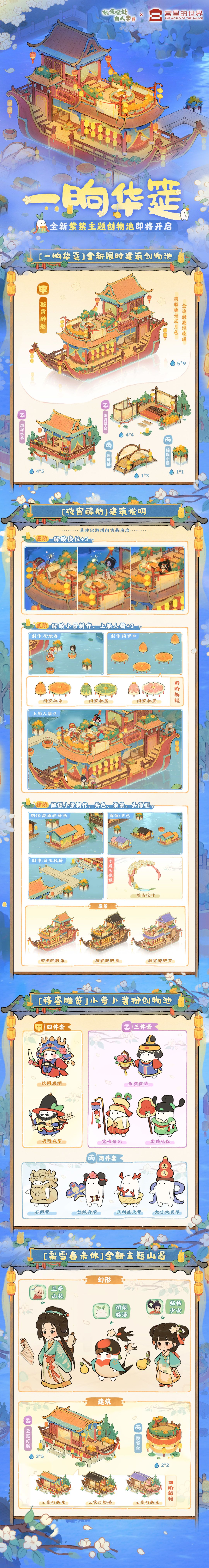 各位萝萝山的山民好呀!「花锦月盏」建筑创物池、「盏盏韶华」装扮创物池以及「一喵一陶然」山遇,即将于6月5日上午10点返场,感兴趣的山民千万不要错过萝! 「锦灯追月」限时UP建筑创物池即将返场 本期限时UP建筑创物池将会上架甲等建筑「花锦月盏」。 不仅能制作「锦鲤灯」「橘妙灯」以及河灯款式「荷花灯」「藤球河灯」,还能使用全新月饼船皮肤,解锁全新专属头像框和染游灯! 「盏盏韶华」小萝卜限时装扮创物池即