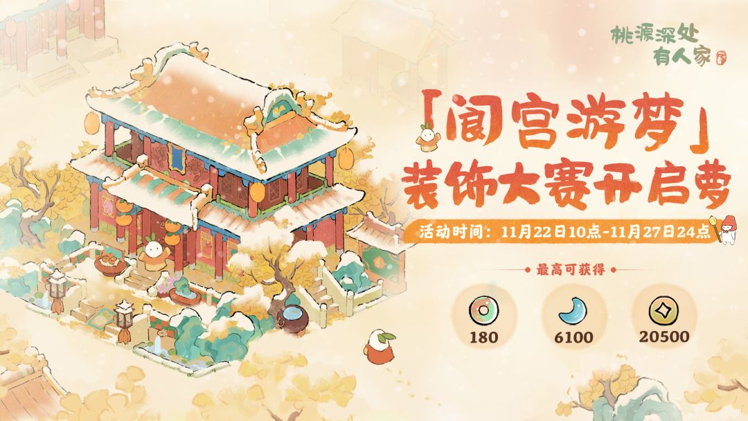 [表情_酷]籁寂寂时星历历,泉涓涓处山萝萝 [表情_开心]各位萝萝山山民好呀!「阆宫游梦」装饰大赛现在已经开启萝!将紫禁城与萝萝山的韵味完美融合,那会是怎样的绝美画卷呢? 活动名称:「阆宫游梦」装饰大赛 活动时间:11月22日10点-11月27日24点 活动奖励:最高可获得玎当*180、玥琅*6100、铜钱*20500 [表情_期待]山民们,是时候唤醒你内心的创意小宇宙萝,用紫禁城的庄重典雅点缀萝