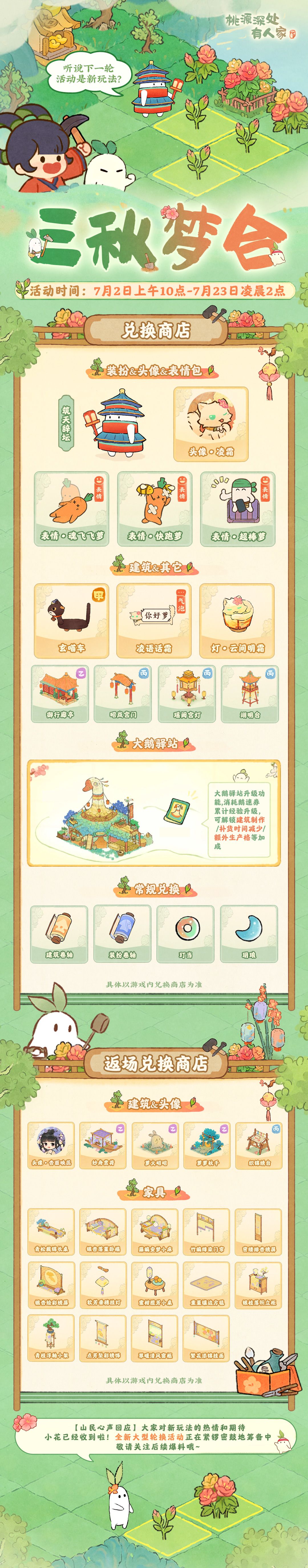 当当 ~小萝卜闪亮登场!7月2日上午10点,「三秋梦合」活动正式开启,兑换商店全新升级,一大波惊喜奖励抢先看! 本次兑换商店上新萝萝装扮「筑天辞坛」、御猫头像以及表情包,更有全新气泡、灯和出行车,感兴趣的山民不要错过萝! 此外,头像「杏面映蕊」以及家具套装「衔织绣坊」等也将同步返场!山民们参与活动即可兑换心仪奖励萝! 【山民心声回应】:大家对新玩法的热情和期待,小花已经收到啦!全新大型轮换活动正在