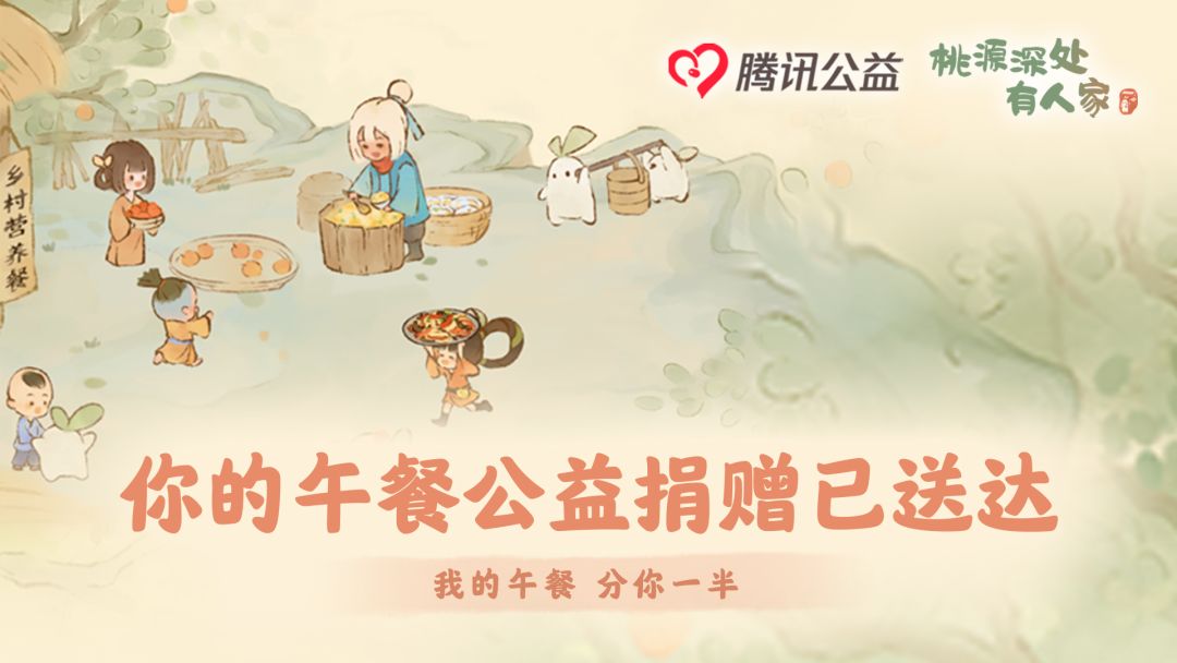 各位萝萝山山民好! 5月,桃源与腾讯公益合作,在游戏内共同发起了“我的午餐,分你一半”公益活动。旨在通过玩家的力量,在游戏内捐赠指定菜品数量达到200万份后,腾讯公益将联合专业公益组织支持不少于520名乡村困境儿童一学期的营养餐。 6月,经过山民们的共同努力下,活动结束时游戏内捐赠午餐数量达2125万份,最终超额完成公益目标!小萝卜在此非常感谢山民们的热情参与(・ω・)ノ 9月,学校开学后,小萝卜