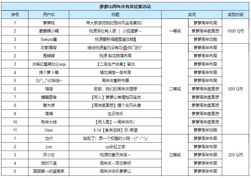 桃源山水美如画,周年庆典赞声隆! 为了庆祝一周年这个极具纪念意义的日子!萝萝们决定福利卷轴加活动,多重玩法齐上线萝!除了游戏内的玩法,小萝卜还特别为山民们准备了另一份福利,建筑攻略秀一波,活动奖励猛猛来,山民们请看下面活动详细内容~ 【活动时间】 投稿时间:2024年3月21日-2024年4月25日 评选时间:2024年4月26日-2024年5月10日 公示时间:2024年5月11日-2024年5