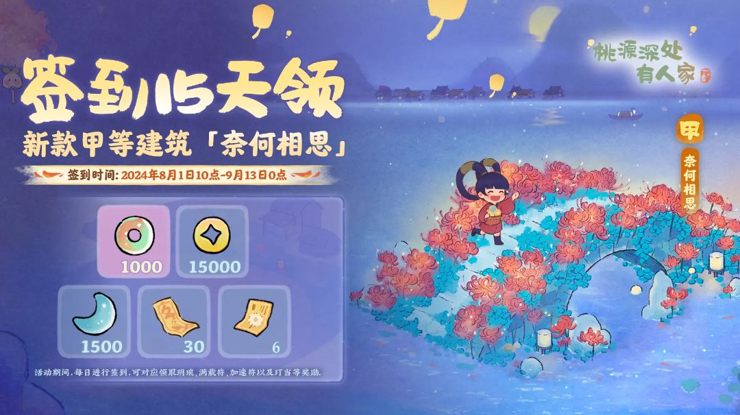 🌱平生稀见赤莲叶,隔桥长梦问人间。 [表情_举手]各位萝萝山山民好呀!中元前瞻签到活动已开启,可前往游戏参与~ 累计完成15日签到,即可领取全新甲等建筑「奈何相思」。 完成全部签到后总计可领取以下道具奖励:铜钱*15000,玥琅*1500,玎当*1000,加速符*30,蒲公英满载符*6 ⭐签到活动时间:8月1日10点~9月13日0点 [表情_开心]小花提醒:8月8日将开启全新主题版本「夏夜庙会 中