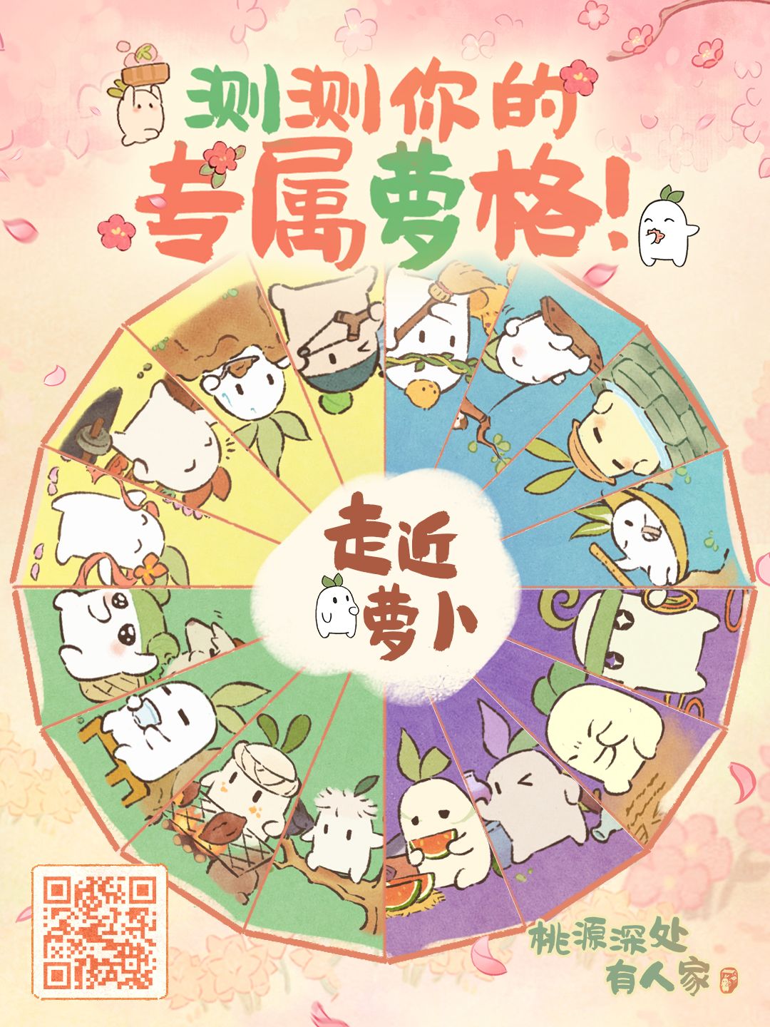 在山民们的呼声中,本周我们来到了周年庆【走近萝卜】特别专场~ 风景如画的萝萝山上,究竟哪只小萝卜与你最有缘分?快来测测吧! (每位萝萝都有属于自己的萝言萝语,在后续,也将公布萝萝们的“萝语词典”,想离萝萝的世界更近一步?届时请来一览究竟!) 参与方式: ①使用创建角色的平台(QQ/微信)扫描二维码 ②点击游戏内【活动中心】进入专属H5活动页面,就能找到萝格测试入口! 欢迎多多分享测试结果,让更多山