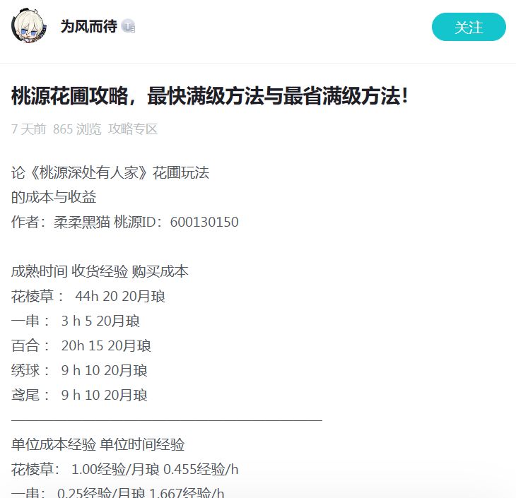萝萝山的山民们,大家好呀~ 小花发现有许多萝萝山的大神,会将自己制作的关于游戏内攻略、布局、视频、同人等内容发布在论坛内,其内容的详细和精致让本萝叹为观止。 今日本萝综合内容质量和内容数据,挑选出部分山民的发帖内容,一同看看吧~ >> 攻略篇 桃源花圃还在担心不会玩?本萝为小伙伴们找到了相关攻略,内含最快满级方法与最省满级方法萝! 点击链接即可查看啦→ 转自作者:为风而待 本萝还为大家找到了超齐全
