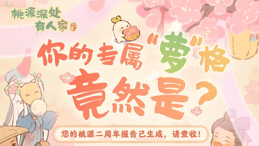 几只萝萝半倾田,顺风顺水又一年。 转眼间,桃源已陪伴大家走过两年的美好时光。为纪念这段珍贵的旅程,萝萝山特别推出「二周年回忆录」H5活动!快前往【游戏内-活动中心-二周岁锦书】,查收这段属于你和桃源的珍贵回忆吧! 带话题#桃源深处有人家 #桃源二周年花朝春晓 #玩桃源的都是自家人 分享自己的二周年称号截图!小花将随机抽5位山民赠送【萝卜甩甩】哦~
