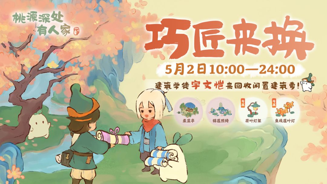 各位萝萝山山民好呀,新一期巧匠来换活动现已开启! 建筑设计师宇文恺再次来到萝萝山回收建筑啦!5月2日10:00-24:00期间,山民可找寻宇文恺消耗已拥有的丙等建筑来兑换乙等建筑「柔蓝亭」、「锦莲照绮」以及活动专属丙等建筑「荷叶灯架」、「鱼戏莲叶灯」。 感兴趣的山民不要错过萝!#桃源深处有人家