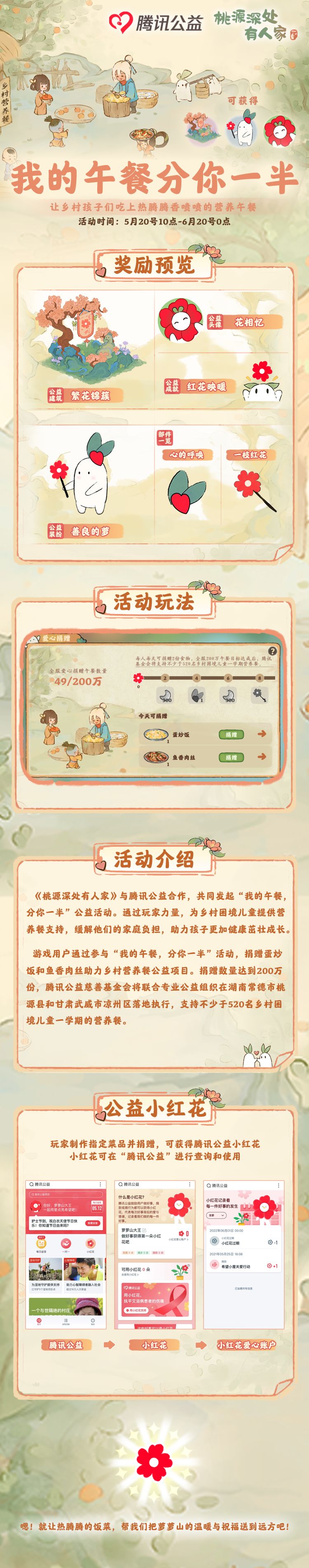 我的午餐,分你一半。 萝萝山将联动腾讯公益,一起为山区的孩子送去暖心午餐。 联动期间山民们可以通过爱心捐赠积累小红花,获得爱心礼物。 炊烟百味,小膳大爱,和小萝卜一起支持公益事业吧! (联动活动将会在5月20日10点正式开启,敬请期待吧!)#桃源深处有人家