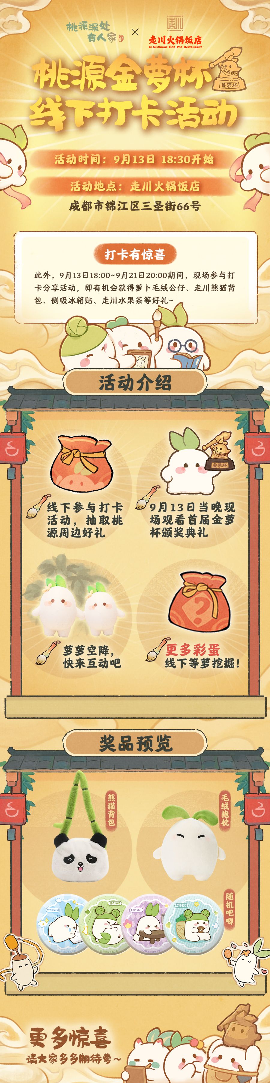 人间烟火处,桃源暖相逢。 首届"金萝杯"颁奖典礼即将启幕,9月13日18:30和萝一起踏入走川火锅店,边涮火锅边为你喜爱的作者加油应援吧! 限时打卡开放: 现场设有互动打卡区,9月13日18:00至9月21日20:00期间,山民们参与打卡活动即可抽取好礼;此外,还有神秘嘉宾亲临现场,给山民们奉上双倍惊喜与快乐! 更多惊喜,等待山民们线下解锁,快和萝开启这场视觉与味觉交织的盛宴吧! #桃源深处有人