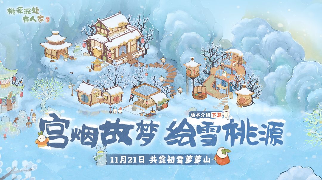 ❄️宫望烟雨思旧梦,雪绘琼枝映桃源。 各位萝萝山山民好呀!天气日渐寒冷,山民们要注意多添衣物,以防受寒哦~ 另外「 宫烟故梦 绘雪桃源」版本前瞻·下篇内容小花也给大家整理好啦!萝萝山玩法升级焕新,快来看看都有哪些内容呢? [表情_期待]11月21日,桃源将迎来今年冬日的第一场雪,期待与每位山民共赏! 桃源乡全新「糖水铺」开业,这个冬天,远游多年的姜奶奶回到了桃源乡。爱喝糖水的她,在西市街边开了一家