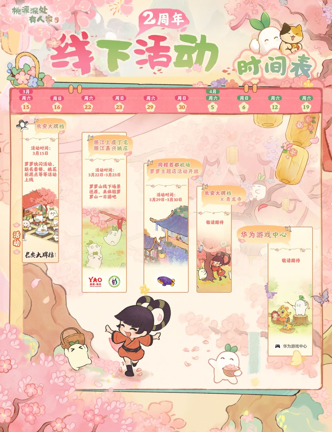 线下活动太多记不住?活动太丰富不知如何时间管理?花朝节·线下活动日历贴心奉上!锁定图上活动时间,一起欢乐启程萝! 活动时间:3月15日 活动内容:长安大牌档-萝萝快闪活动、联名套餐、桃花祈愿点等等活动上线! 活动时间:3月22日-3月23日 活动内容:浙江上虞丁宅浙江嘉兴姚庄-萝萝山线下场景还原,来体验萝萝山一日游吧! 活动时间:3月29日-3月30日 活动内容:同程首都机场萝萝主题店活动开放 活