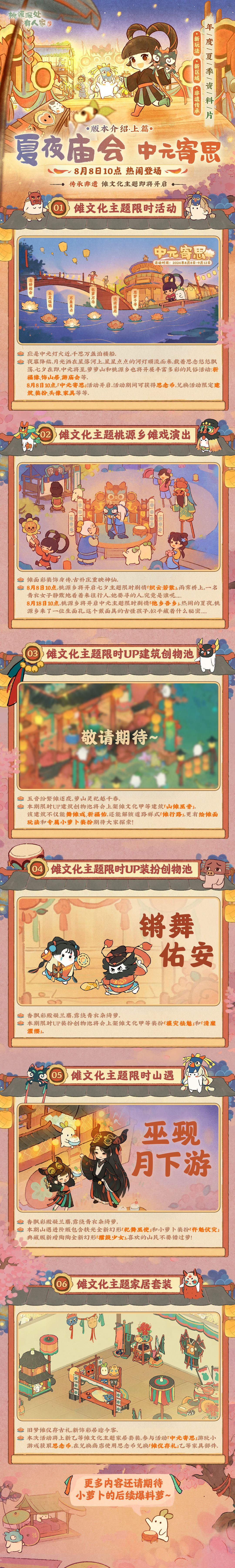 🏮夏夜星繁喧庙市,中元灯火寄相思。 [表情_期待]各位萝萝山山民好呀!桃源年度夏季资料片版本「夏夜庙会 中元寄思」8月8日即将热闹登场,傩文化主题限时活动、创物池、山遇以及桃源乡傩舞演出等内容即将开启萝! [表情_开心]小花整理了本次版本的前瞻内容说明,快随小花一起来看看新版本前瞻内容上篇的中元主题活动爆料萝! ⭐更多版本相关内容,还请留意小花的后续报道萝!#桃源深处有人家