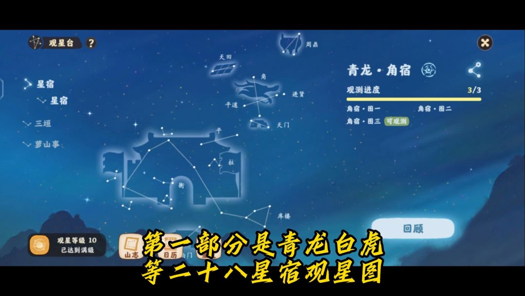 基础星图 七天一个圣兽星宿,28天完整四个。 错过要再等一轮。(可以用观星石观看前面的500一个,可看一次)。 进阶星图 4月20日10点观星七级解锁太徽垣书籍,杂货铺2000月珰 4月22日10点观星八级解锁天市垣书籍,杂货铺3000月珰 4月26日10点观星九级解锁紫薇垣书籍,杂货铺4000月珰 注意,基础和进阶都是共享每天次数,每天只能看三次。 进阶星图需要在观看的时候 点左边的相应的解锁了