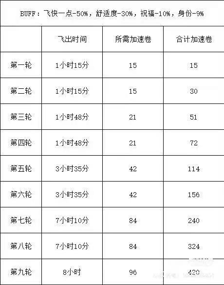 下次御风而行的活动时间是6月19日,每个人的减飞行时间buff可能因为等级(等级越低飞的越快)、舒适度、身份等级等等影响,会与图上时间不符,自行调整~主要是有5个技巧。 ①飞快一点buff要在活动前一天用性价比最高,可以多享受半天buff,推荐前一天中午或者下午开启,第二天用加速符加速时要在buff结束之前加速,保证利益最大化! ②飞快一点buff生效时会立即对当前飞行生效,所以不要等飞回来的时候