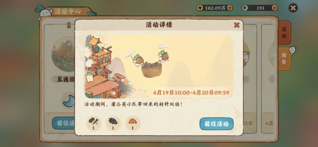 🌠活动期间蒲公英小队带回来的材料双倍🫧 ↘️准备1:前一天的带回来的不要着急获取,活动开始自动会显示成双倍材料,这样就节省了一次飞行时间[暗中观察R] ⤵️准备2去找老爷爷开buff~ 🔄解锁家园全部成就需要15次(蒲公英小队要飞五次) 准备三: 1、(1)小麦🌾(2)大豆 (3)甘蔗(4)白菜🥬 (5)辣椒🌶️ 每次需要15个农作物随机~(本人仓库备🈵500个) 2、仓库不够的,需要解锁成就的可