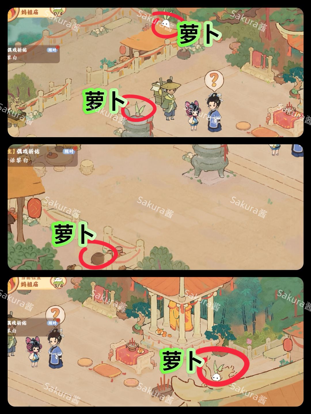 桃源|山闽潮声剧情攻略:找萝卜day1篇 附簪花拼图🧩两张! 攻略图已圈⭕萝们直接按攻略完成任务吧[表情_比心] #桃源深处有人家 #桃源深处有人家萌新攻略