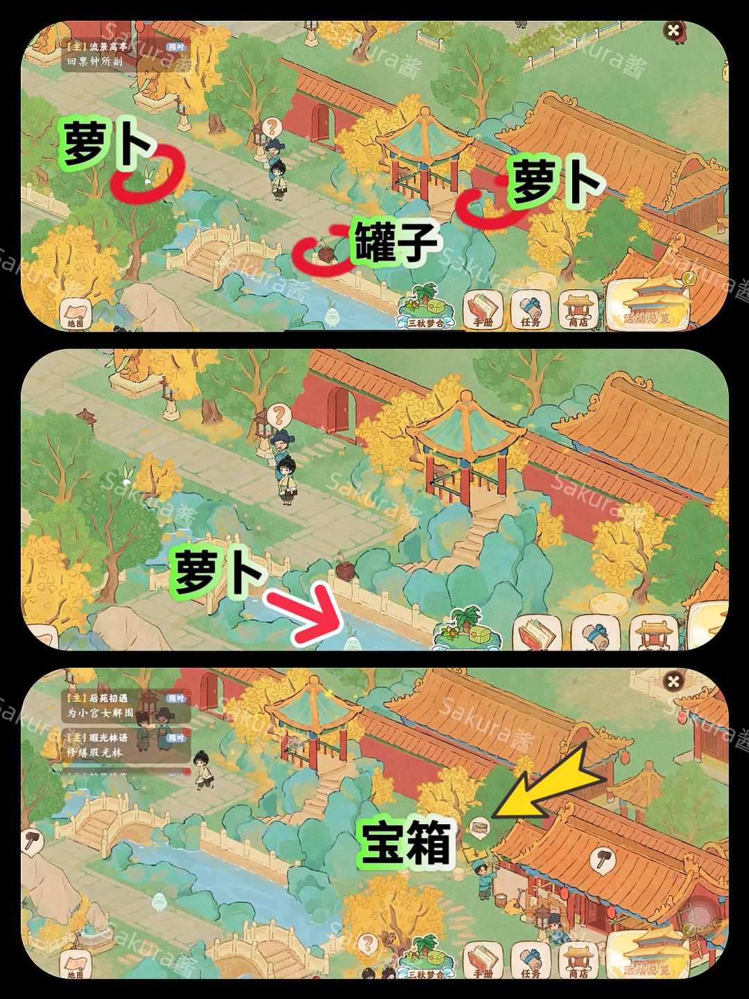 新剧情里有宝箱和小萝卜喔举手[表情_举手] 还有卷轴呢! 萝们按攻略图领起来吧! #桃源深处有人家 #桃源宫烟故梦 #桃源紫禁攻略