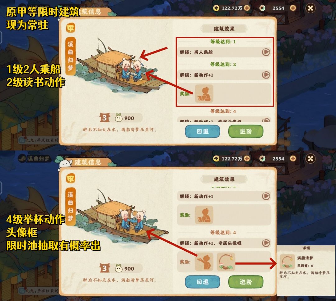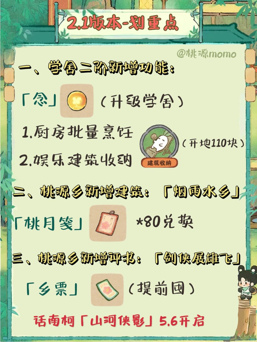 明天更新2.1新版本,奉上值得留意的三点: 一、学舍新增功能(厨房批量烹饪/娱乐建筑收纳) tips:萝卜学舍需要消耗念解锁升级;建筑收纳前提是开地110块;推荐优先升级这两个功能哦! 二、桃源乡新增主题建筑「烟雨水乡」 tips:需要开始囤桃月笺*80兑换(甲级建筑) 三、桃源乡新增评书和即将开启新的话南柯「山河侠影」 tips:需要提前攒乡票#游戏种草计划#攻略#桃源深处有人家