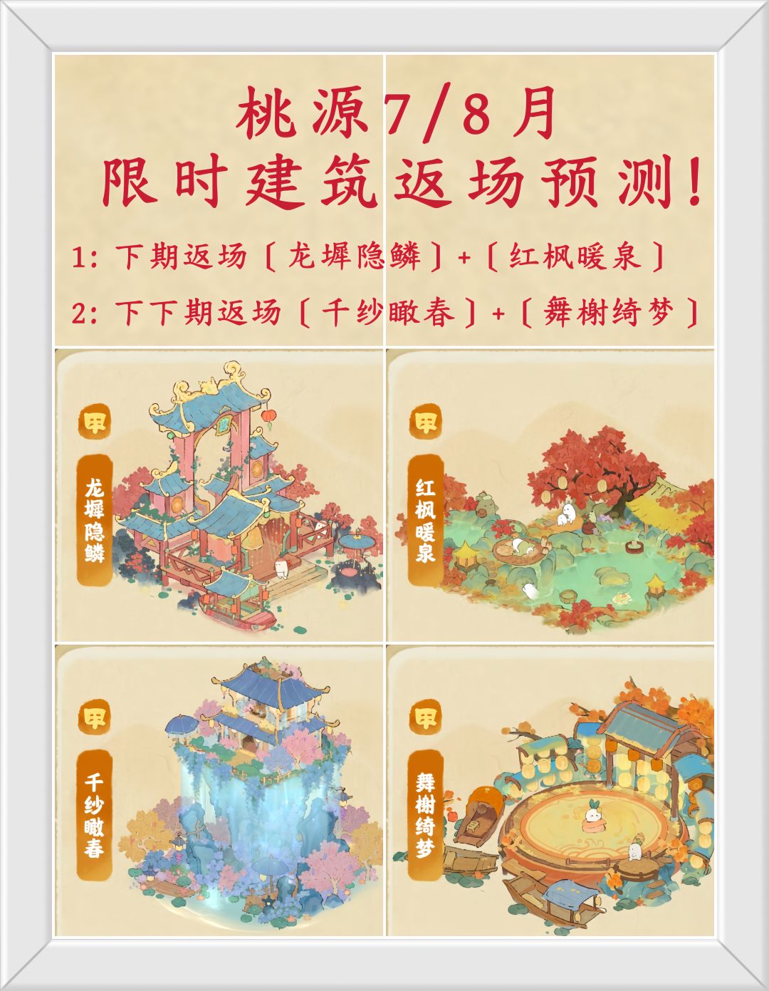 1:下期预测返场〔龙墀隐鳞〕+〔红枫暖泉〕 2:下下期预测返场〔千纱瞰春〕+〔舞榭绮梦〕 3:我不是官方工作人员,具体限时建筑返场还需以官方的公告为准。4:姐妹们可以按照本人的预测为后期抽卡池提前做好卷轴抽卡准备。攻略整理制作者:都市追梦人168 #游戏种草计划 #今天游戏圈发生了啥 #桃源深处有人家