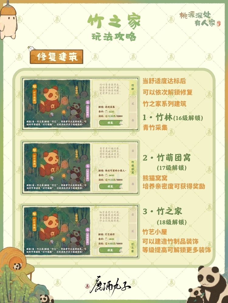竹之家玩法攻略 🌿图1-竹之家系列建筑修复 🌸竹林·16级解锁 🌸竹萌团窝·17级解锁 🌸竹之家·18级解锁 🌿图2-竹林 🌸生产青竹 🌿图3-竹萌团窝 🌸喂养熊猫·培养亲密度 🌸亲密度等级奖励 🌿图4-竹之家 🌸制造竹制品装饰 🌸触发巧思 🌿图5-竹之家 🌸竹艺等级奖励 加油升级,去拥有属于自己的阿胖达吧!#攻略