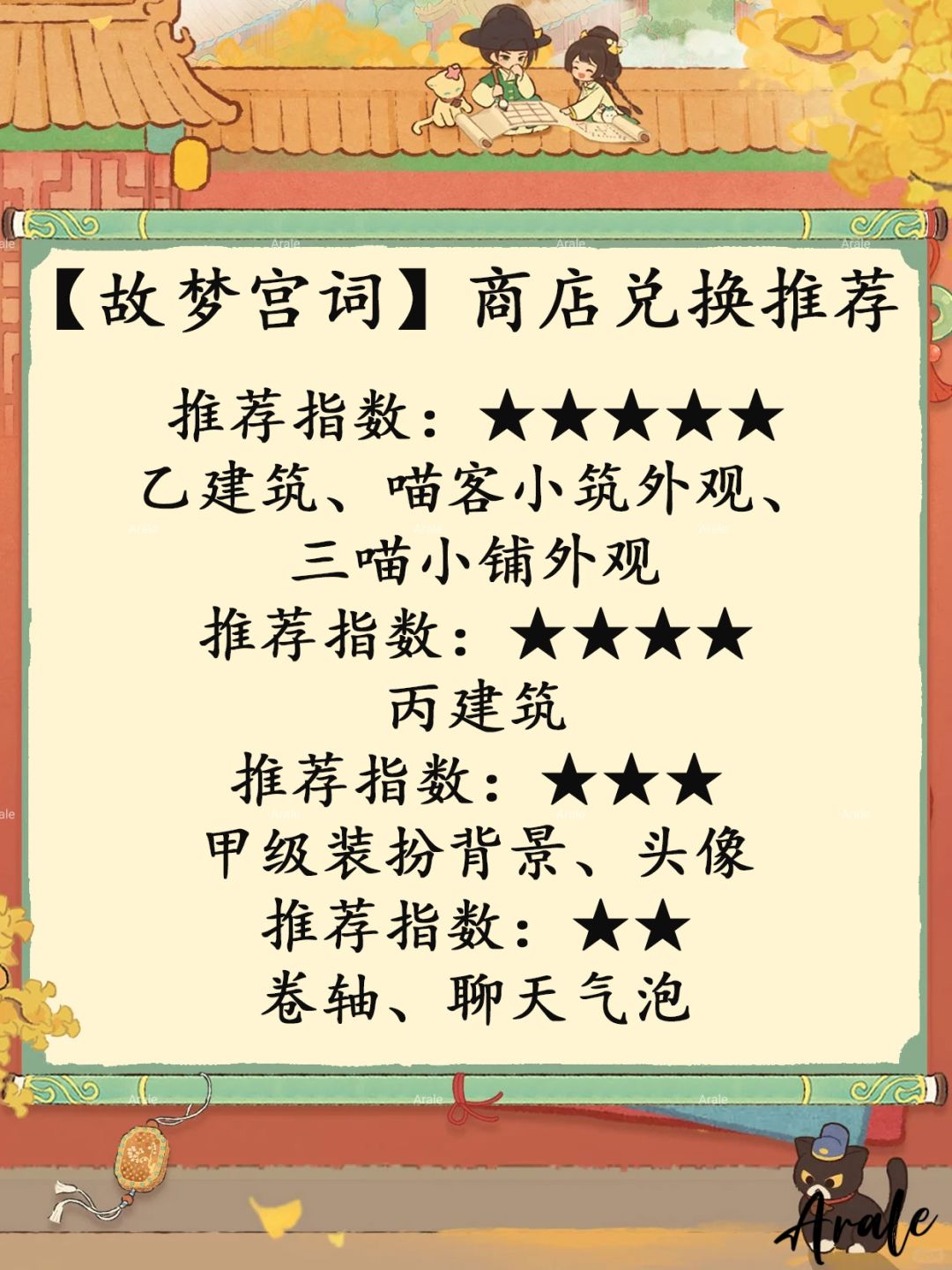 【故梦宫词】商店兑换推荐,推荐指数:★★★★★:乙建筑、喵客小筑外观、三喵小铺外观。推荐指数:★★★★:丙建筑。推荐指数:★★★:甲级装扮背景、头像。推荐指数:★★:卷轴、聊天气泡。#桃源深处有人家