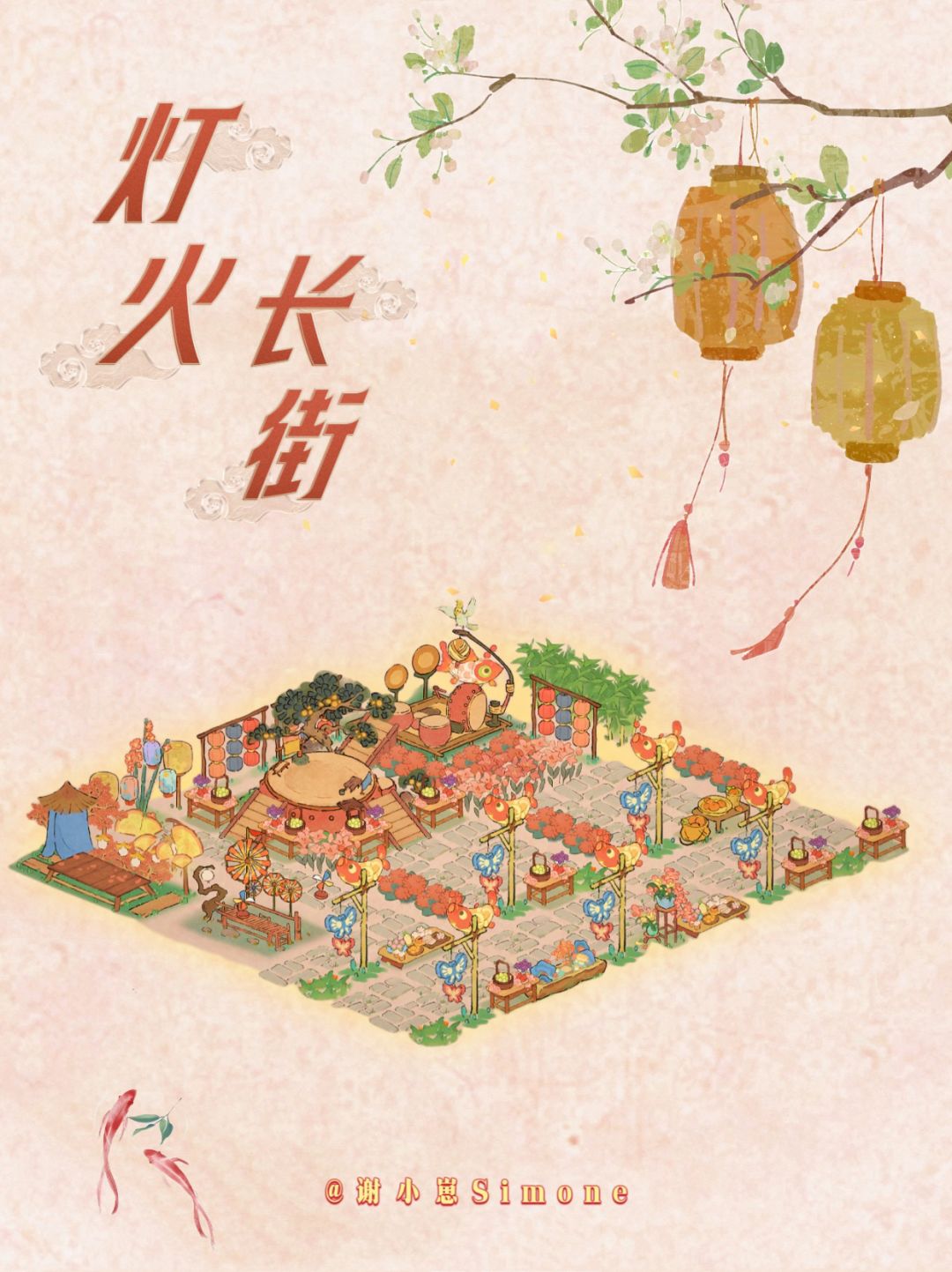 「灯火长街」庙会风&娱乐建筑 [表情_比心]花灯架应用示例~这个四通八达的模版很好用,可以连接很多布局,比如之前我发的《桃源商会》生产布局,和灯火长街非常契合~还可以根据街上建筑的色彩,修改花灯架的颜色(见上篇《花灯小景》)。 [表情_比心]造景已发:wz193073(V区) [表情_比心]作业抄回家随意,搬运造景展需标注作者信息,原创不易,谢谢支持和鼓励。#桃源布局大赏#桃源深处有人家#桃源深处有人家攻略