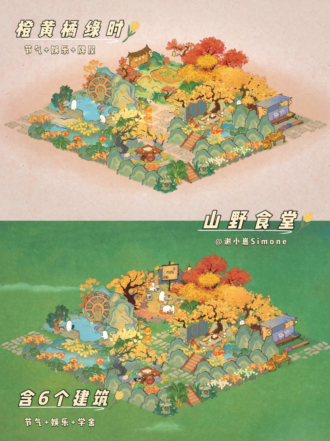 造景已发:wz254598 立冬节气建筑「金枝玉饺」的拓展布局,6个建筑组合成山野秋色。在去上学or打萝卜牌的那条小路上,有两家非常值得打卡的山间小食堂。 📝建筑清单如下: 1⃣️节气建筑:金枝玉饺 2⃣️节气建筑:秋语相思 3⃣️娱乐建筑:萝卜墩墩 4⃣️娱乐建筑:布偶戏台 5⃣️创物甲级:叮咚水车 6⃣️生产/互动建筑:学舍or牌屋(二选一)都很搭这个场景~#桃源深处有人家#游戏安利#桃源深处有人家装修