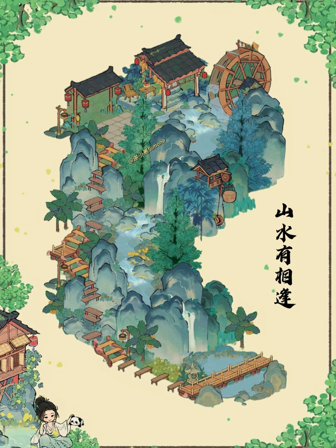 3.23 ①访客区 为了避免访客入口处显得狭窄不宜使用大体积建筑装饰。 水面装饰的倒影和中心路灯的搭配很好看,右侧装饰群同样为了避免喧宾夺主而使用低矮建筑。 ②餐桌一带 河道和浮木桥的搭配可以在追求温馨效果的同时避免空间拥挤和装饰单调。 ③蒲公英小队 后期会减少建筑密度使蒲公英小队附近看起来更宽阔。 ④村角 简单的宁静和中心的繁华互相衬托。 ⑤中心部分 等日后抽卡多了再作调整。 ⑥烟火气一带 桥头