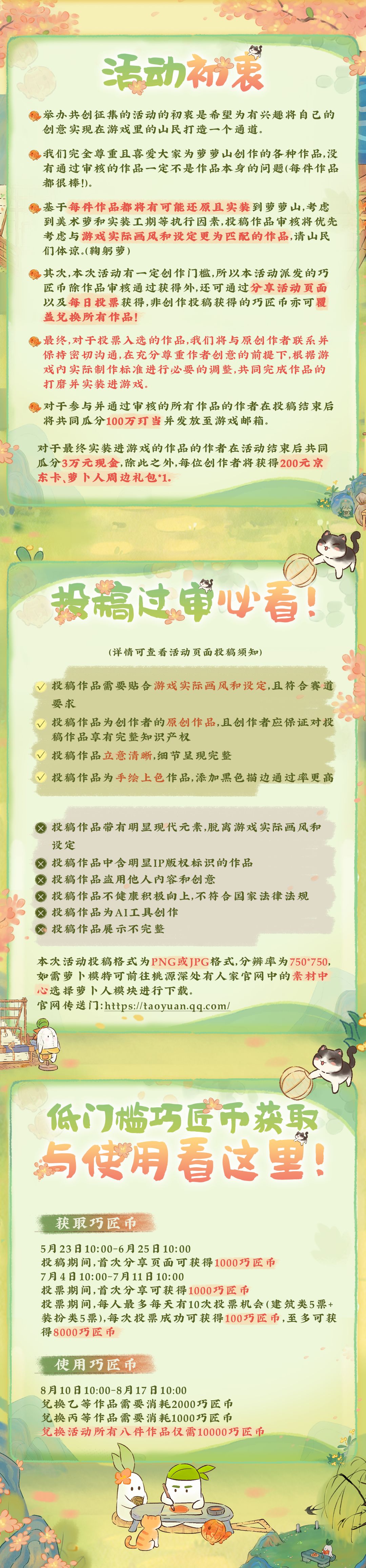 各位山民们好呀! 「萝萝山巧匠共创征集」活动已开展一周,小小萝真切地感受到了大家的创作热情! 活动上线后,审核萝收到了2万余份投稿!(审核萝血条已空~.~) 同时,很多山民对活动规则不太了解,小小萝邀请了审核萝对山民们热议的问题进行解答。 如有其他疑惑也可在下方留言,小小萝将进行解答~ #桃源深处有人家 #巧匠共创
