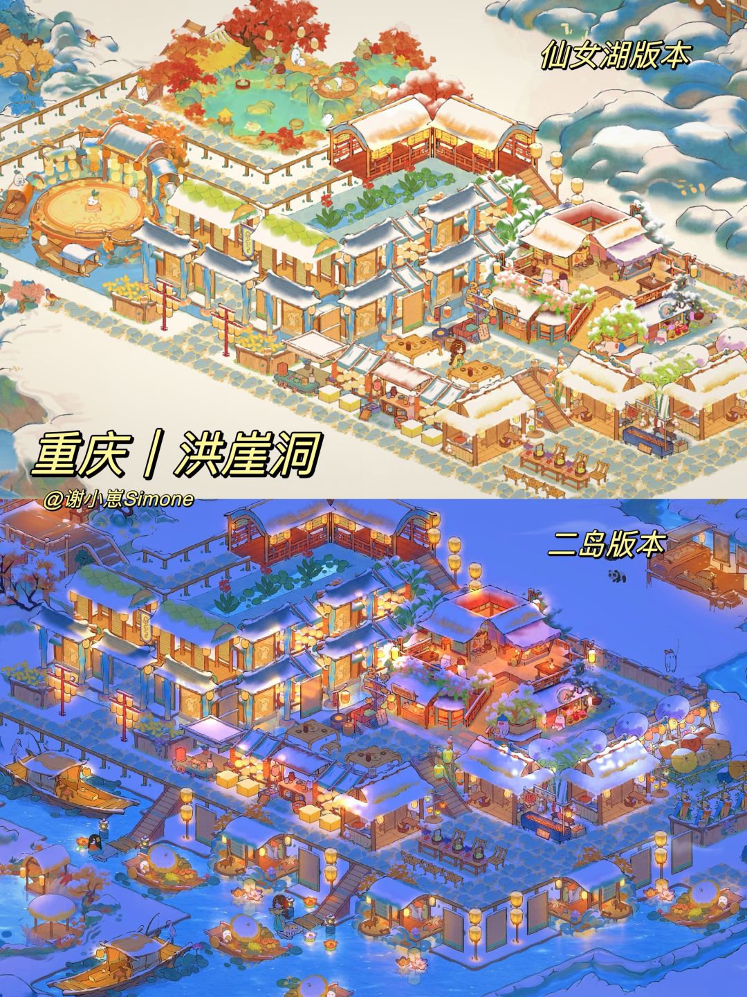 自汴京樊楼、敦煌石窟后,新的地标系列「洪崖洞篇」来啦,不能一比一复刻,只能说现实建筑带来了一些灵感,并在桃源里实现~~这次主要是用了桃源乡的奢侈建筑「烟萝朝市」和一些「市集小物件」,功能区有酒楼、纸伞铺、烤肉摊、蜜饯铺等等,充满烟火气息又很豪华的布局。 [表情_比心]抄录已发,请大家跟着图8打点的顺序搬哈~ [表情_比心]红点区域—洪崖洞1:wz390047 [表情_比心]蓝点区域—洪崖洞2: