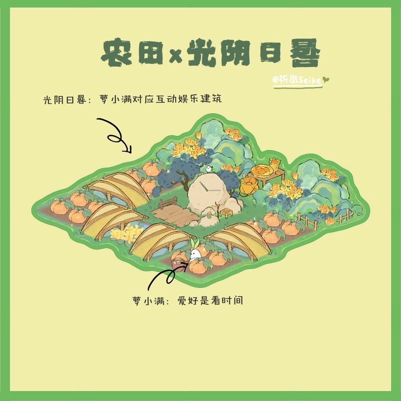 🥕桃源深处有人家:农田x光阴日晷布局 🍃生产建筑小萝卜x对应娱乐建筑布局(二) 🍃主要建筑:农田、光阴日晷、芳菊林耀 🍃布局思路:农田有一个浇水的小萝卜名叫萝小满,萝小满的爱好是“看,时间走动。”与萝小满对应的互动娱乐建筑就是光阴日晷~所以把这两个建筑放在一起布局啦。#桃源深处有人家#桃源深处有人家布局展示