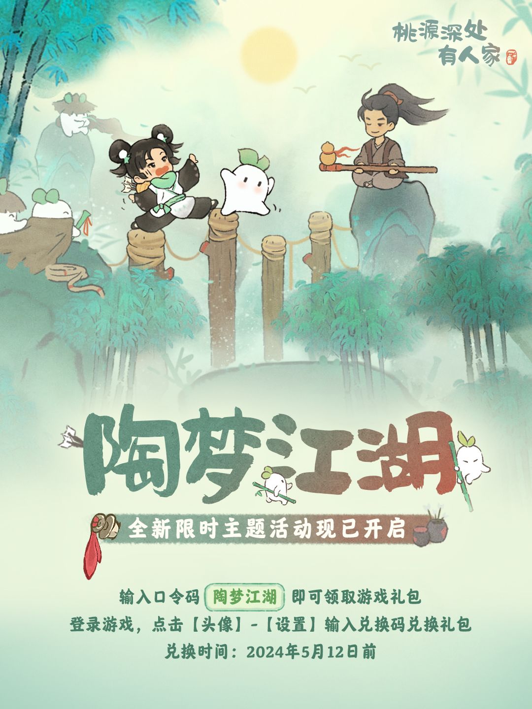 英风侠骨江湖梦,赋诗鞍马气纵横。 新版本「陶梦江湖」4月25日豪情登场,陶陶大王和马大卫将代表萝萝山参加桃源乡武林大会,山民可前往桃源乡助力陶陶成为盟主吧!参与「陶梦江湖」活动获取侠客币,还能兑换全新背景、头像和建筑等奖励,往期农忙时节活动商店奖励也会一并返场。感兴趣的山民们不要错过萝! 小花福利提示:输入图中口令码【陶梦江湖】即可领取游戏礼包,兑换时间截止5月12日前萝!#桃源深处有人家
