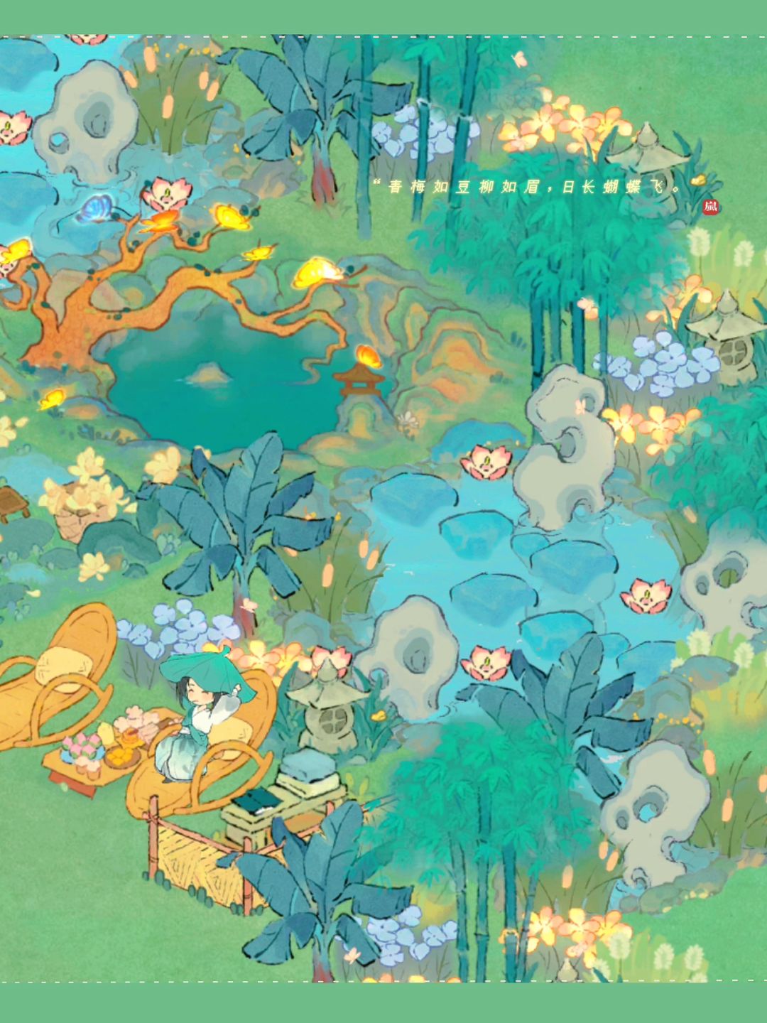 🍃彩蝶绕枝·昼|一分钟学会夏日布局 🦋桃源深处有人家|彩蝶绕枝布局 🍃一分钟学会彩蝶绕枝布局:超适合夏天的桃源布局 🦋主要建筑:彩蝶绕枝、木兰素玉、枕梦摇椅、芭蕉、狗尾巴草、草篱笆、杂物石凳、荷花水灯、花菱草·蓝、水青砖、明院灯、石幢灯、糕点桌#萝萝古镇攻略征集#桃源深处有人家#桃源深处有人家布局展示
