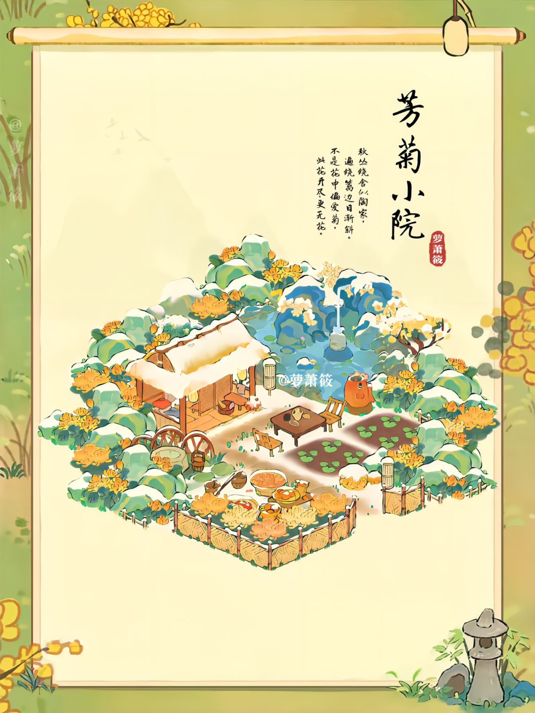 桃源|「芳菊小院」农家田园布局(附地基) 秋丛绕舍似陶家,遍绕篱边日渐斜。 不是花中偏爱菊,此花开尽更无花。 —元稹《菊花》 这里没有大城市的繁华 却有人间最纯净的朴素 平淡中有小小的温暖 寂静时有淡淡的心安 与好友对饮赏菜 闲谈日常 主要建筑:沐衣香斋 凝心静水 芳菊林耀 坐井观萝 🌸抄作业随意哦,若发布平台记得@我就好啦,禁末授权商用和搬运,谢谢喜欢。#桃源深处有人家#桃源深处有人家布局展示#桃源深处有人家装修