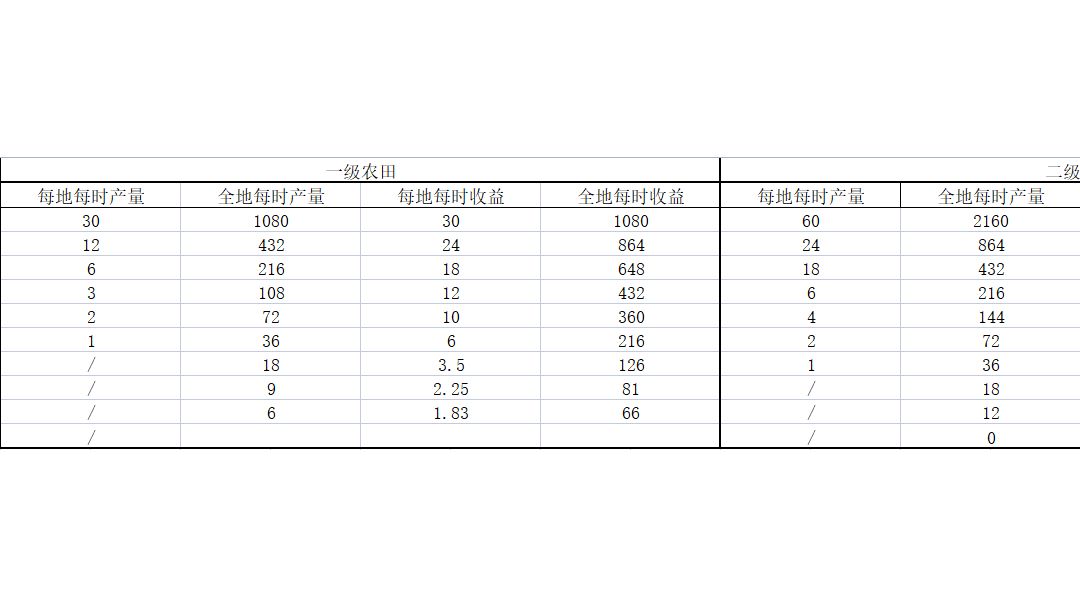 种小麦才是最赚钱的!!! 本人大致计算了农作物收益情况如下表 所有作物中,小麦价格最低,但是在充分利用资源的情况下,小麦的收益是最高的,每小时可以收入1080铜钱,如果是2级农田,每小时可以打到2160铜钱 本人还计算了菜品收益,一级菜谱中清汤白菜收益最高,按照每份材料做2份菜的情况计算,每小时清汤白菜的收益是840,按照每份材料3份菜的情况计算,每小时清汤白菜的收益是1260,这是农田全部是2级