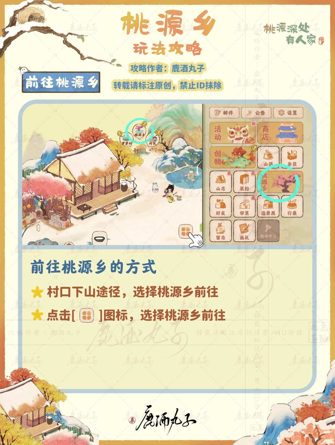 ⭐开放等级:20级 🌿图1-前往桃源乡的方式 🌸村口下山 🌸图标合集 🌿图2-游乡里程 🌸每周里程奖励上限100(超出部分可记录里程,但无额外奖励) 🌸游乡获得的乡票可在桃源乡的商铺里购买道具、装饰等 🌿图3-桃源乡乡民 🌸支持乡民营生可提升好感 🌿图4-结识乡民 🌸如何结识乡民 🌸乡民位置标记 🌿图5-吉祥楼 🌸解锁吉祥楼地方菜学习需烹饪等级达到2级 🌿图6-渔铺 🌸钓鱼新机制 🌸自动钓鱼 🌸新