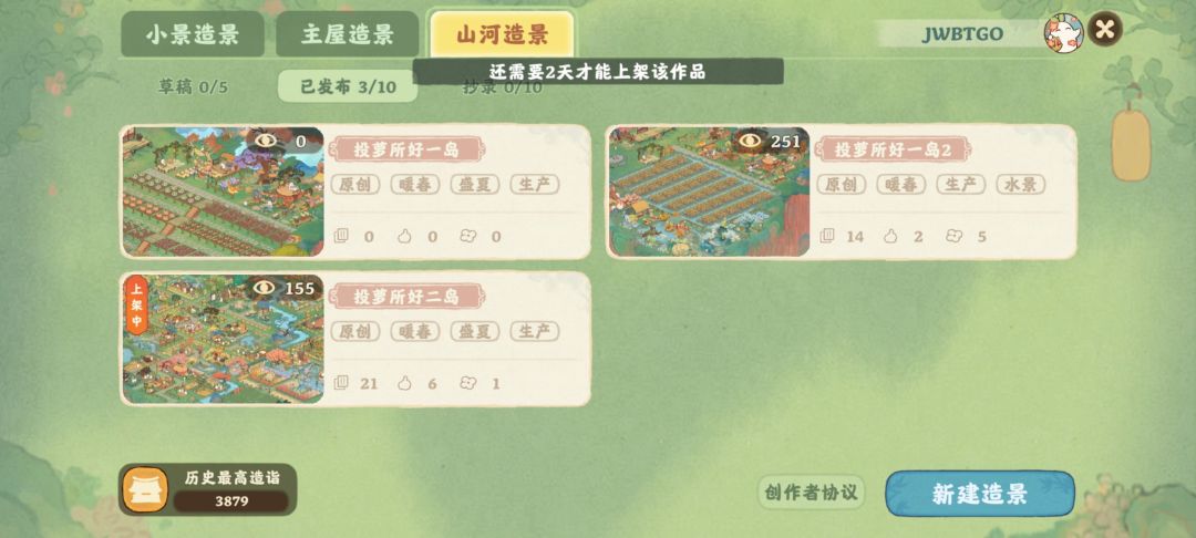 每个娱乐建筑对应一个打工萝的心愿————为了查看它们的心愿,我特地注册了个小号去建筑栏里看😅 之前刷过一篇帖子的布局是娱乐建筑+工坊+部分作物土地,我觉得这是一个很好的思路——每个作坊有一个打工萝,每个打工萝都有自己的爱好,而这些爱好都有对应的娱乐建筑,因此我们可以给辛苦打工的萝一个舒适的可以劳逸结合的工作环境(这也是我梦寐以求的😭)。为此,我耗时4个小时精心打造了一岛——— 这里容我解说一下,首