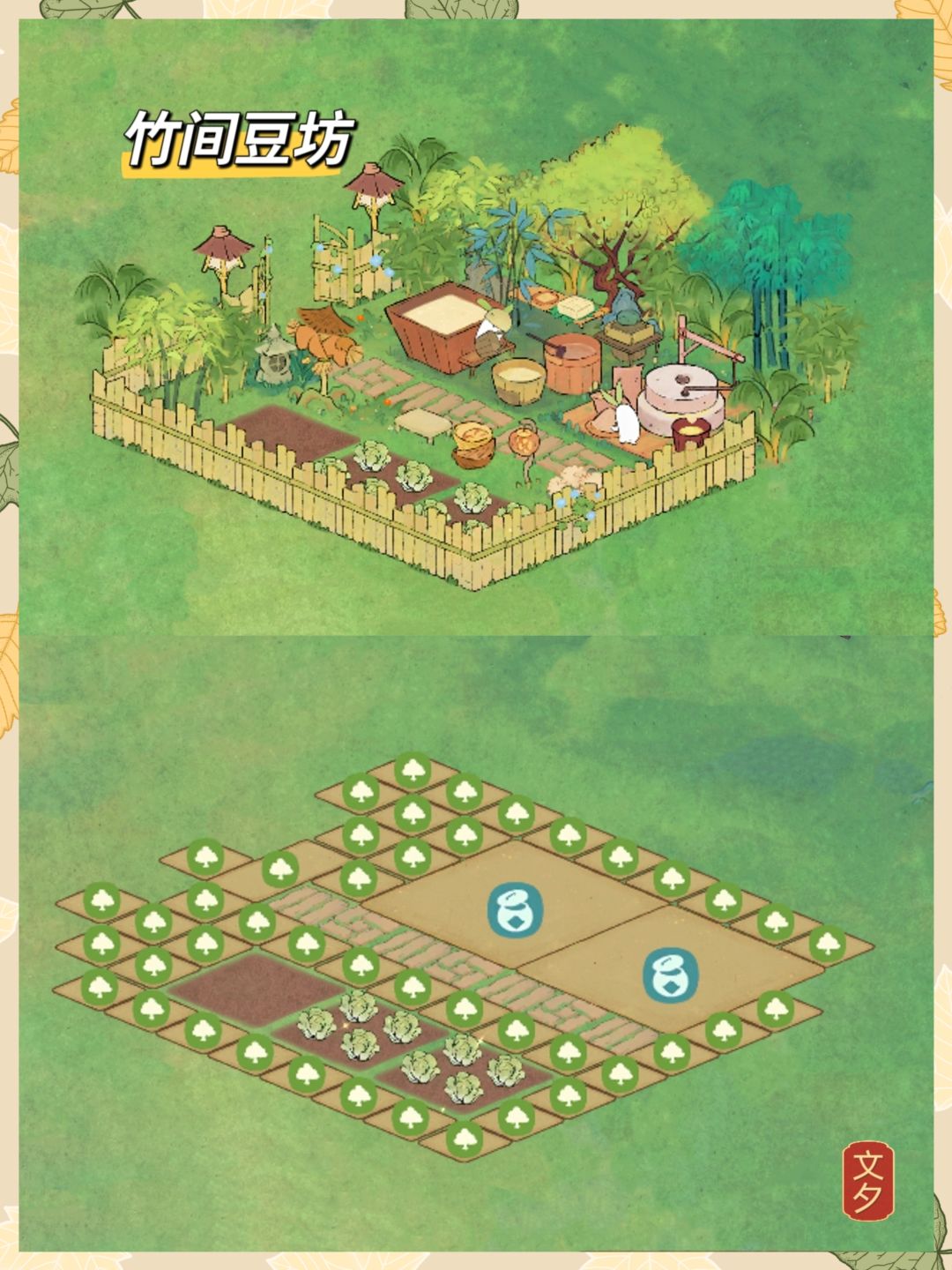 继上一个视频贴的农田场景布局分享。 游戏中一共有36块田地,在家门口这部分(见封面)已经使用了18块,那么剩下的一半田地又有什么新的布局呢? 下面来分享另一种思路。 如图,以陶土房为起点设计。 铺石板路,熟悉的水渠围绕灌溉,中间搭建一块浮桥通路,再用栅栏圈起菜地,别忘了放只扁担。 旁边搭配一块小小盆栽园,好看,爱了。 熟悉的田间小陌分隔田地面积,避免集中摆放太过单调。 没有水井了,因此换成类似水井