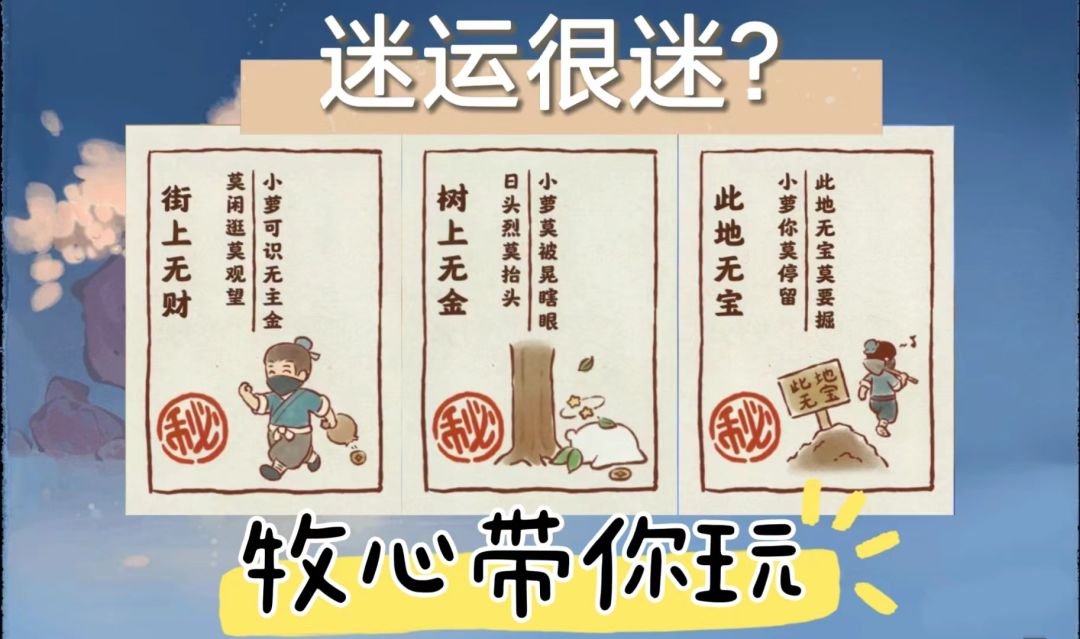 目前只开放了三个迷运 ①街上无财位置:灯笼铺右下方台阶边上(p2) ②树上无金位置:河灯摊上方,棠梨花蹊地名的棠字处(p3) ③此地无宝位置:游艺社所在房舍后面的河边。(p4) 注意事项:占星得到迷运后半小时内去找到,萝萝山也不要选择过夜,超过将无法触发彩蛋,或者彩蛋会消失! 这里是牧心!桃源指南针,迷运不迷惑!