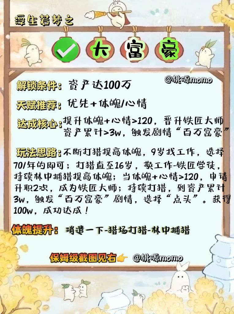 哈喽,宝子们!话南柯-山河侠影最新成就“大富豪”保姆级攻略来咯! ✔️1、开局天赋选择增加体魄/心情,期间尽量点消遣-林中捕猎或骑马捕猎,直到9岁找工作,选择概率大且70/年的。 ✔️2、9岁~16岁期间,持续选择消遣一下-狩猎-林中捕猎,不断提高体魄。 ✔️3、16岁后,点击「工作」-「换工作」,加入「铁匠学徒」。 ✔️4、持续林中捕猎,提高到体魄+心情>120时,申请2次「升职加薪」,成为铁匠