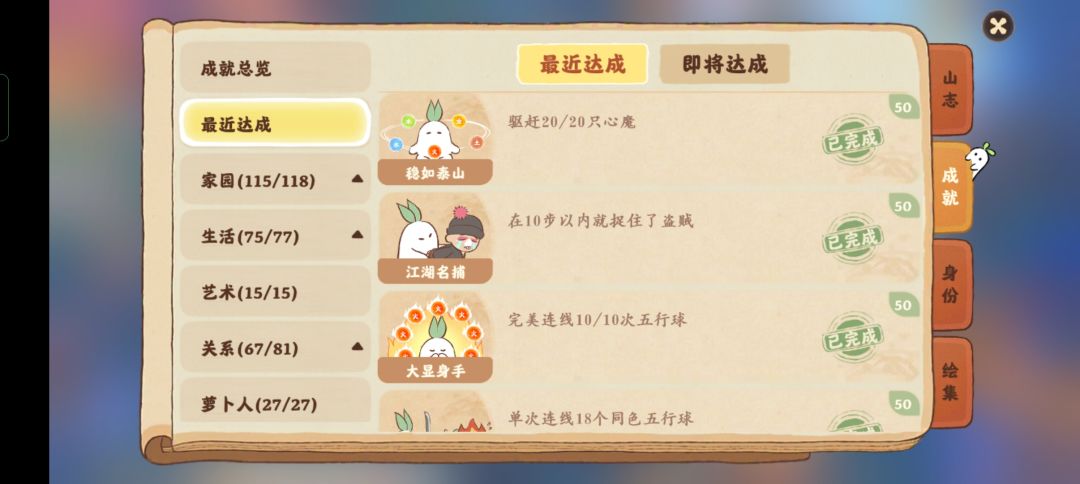 追捕令游戏: 成就1:「江湖名捕」10步内抓住盗贼 心魔游戏: 成就2:「稳如泰山」驱赶10只、20只心魔 成就3:「大显身手」完成5次、10次完美连线 (一次连线10个以上球为完美连线) 成就4、5:「清场高手」一次连15个、18个同色球 #桃源深处有人家 #桃源深处有人家攻略