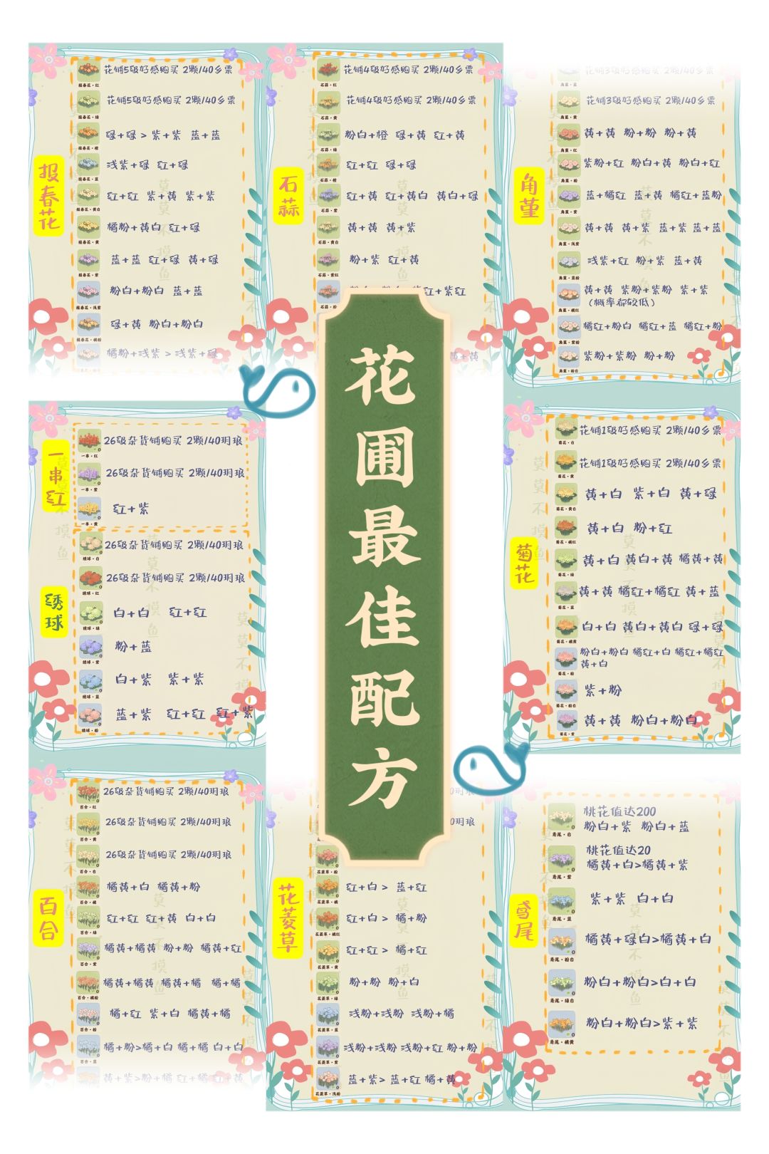 哈喽,宝子们。我是莫莫,是谁催了很久的全部配方攻略,请查收~ 这次把桃源乡的花种也优化合并到一起啦~ ✔️1、家园花种(一串红/绣球/百合/花菱草/鸢尾) 一串红:3种 绣球:6种 --制作宁神香,可持续提高萝卜15分钟的生产效率。 百合:10种--制作舒心香,可持续提高萝卜30分钟的生产效率。 花菱草:10种--制作活气香,可持续提高萝卜60分钟的生产效率。 鸢尾:6种 ✔️2、桃源乡花种(菊花