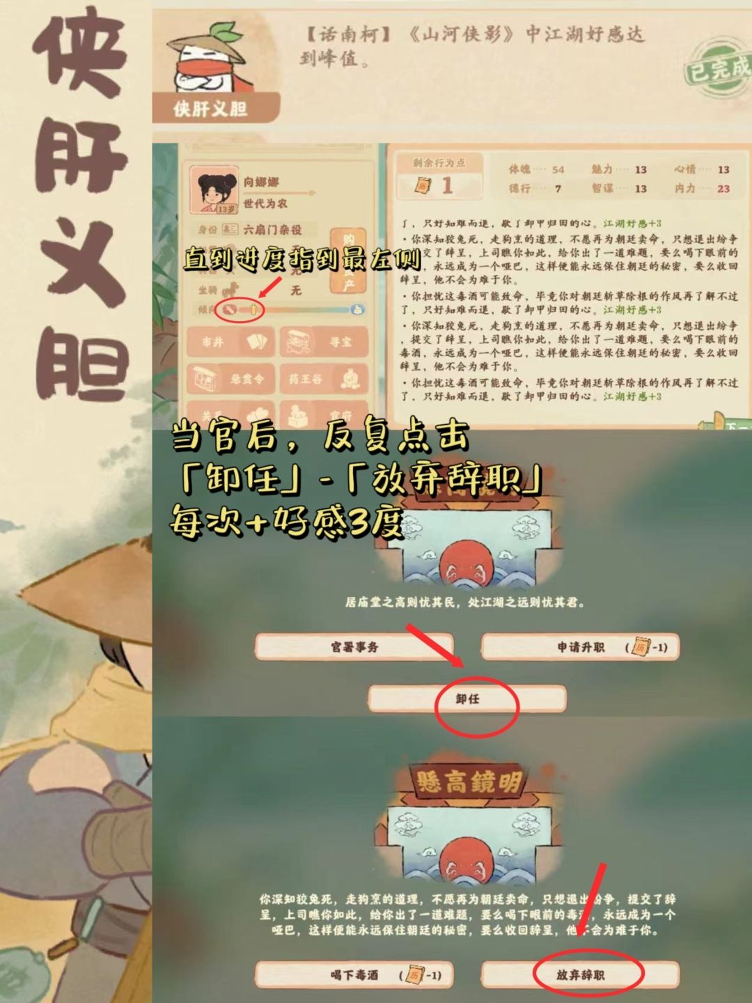 侠肝义胆有一个速刷方法 1、9岁就选择当官(体力太低就选偷师学艺) 2、然后反复选择「卸任」-「放弃辞职」,每次江湖好感+3 3、直到江湖好感满(进度最左) 4、消耗体力,进入下一年即可解锁 关注momo,不迷路~#游戏种草计划#游戏安利#攻略#桃源深处有人家攻略#桃源深处有人家