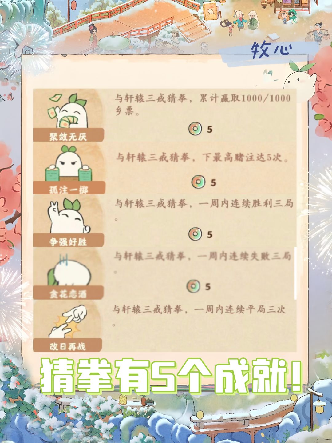 今天又解锁一个孤注一掷成就!加上之前笔记大家的反馈。一共整理了5个猜拳成就! 分别是: ①聚敛无厌 ②孤注一掷 ③争强好胜 ④贪花恋酒 ⑤改日再战 猜拳玩法位置在图3,一周只有三次猜拳机会,每周一刷新次数! 我自己只做成了前面两个!一周要做到三次猜拳结果一样真的好难!总感觉猜拳还有什么未知的隐藏成就等着大家去发现!这里是牧心,感谢关注!#游戏种草计划#游戏安利#游戏推荐#攻略#游戏讨论#游戏资讯