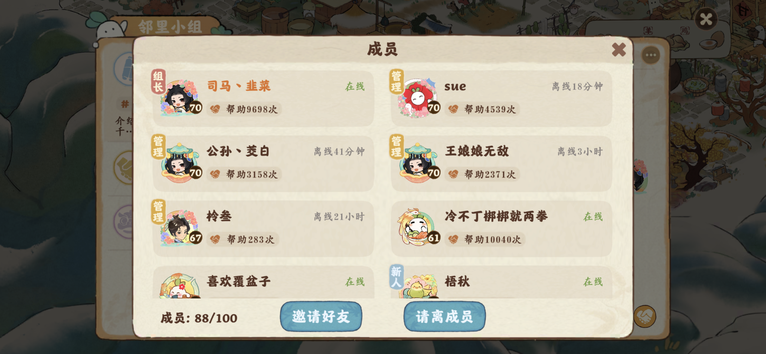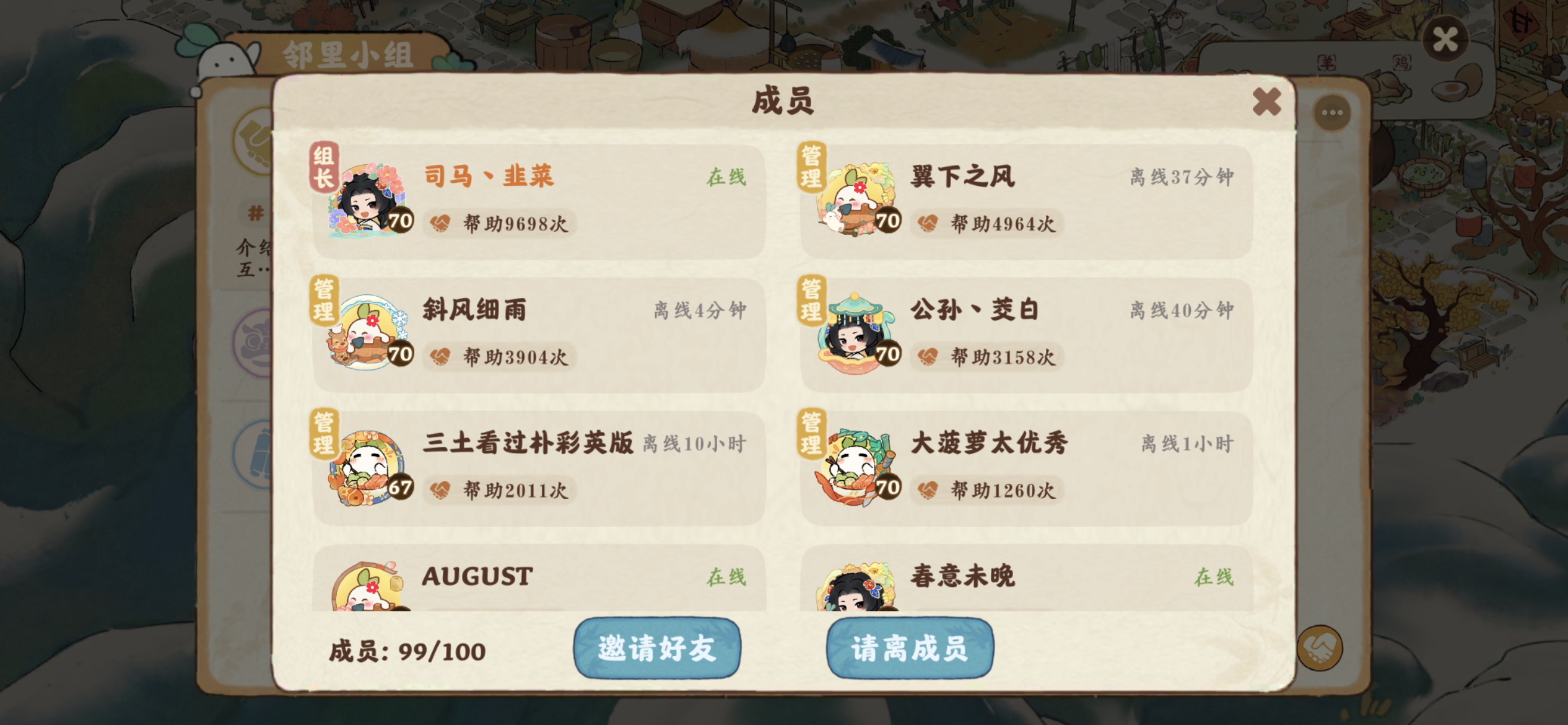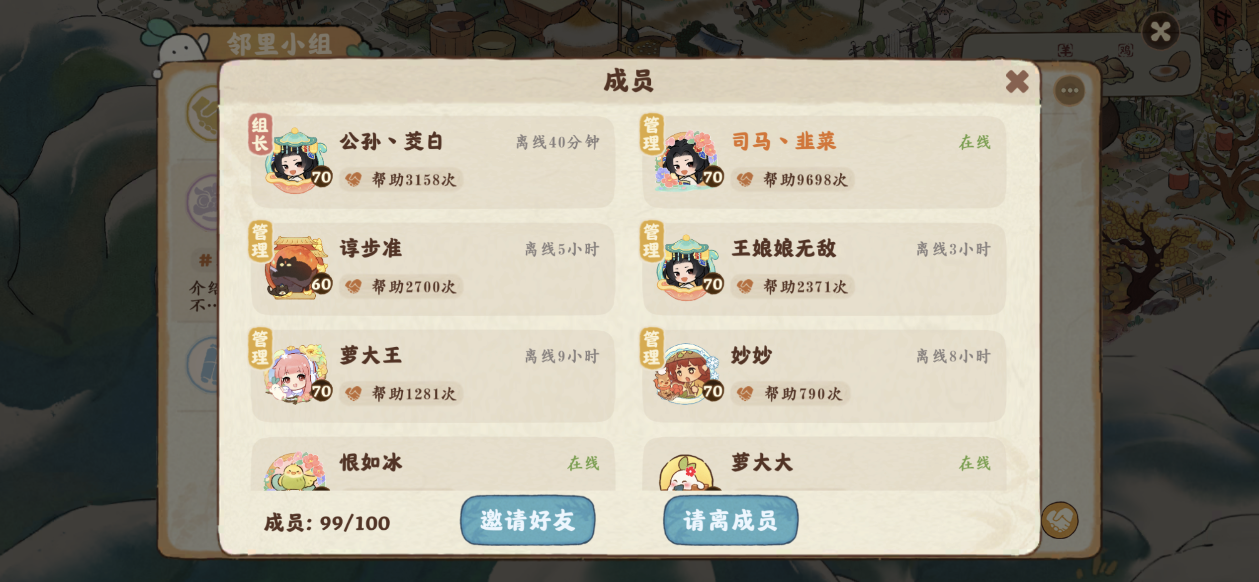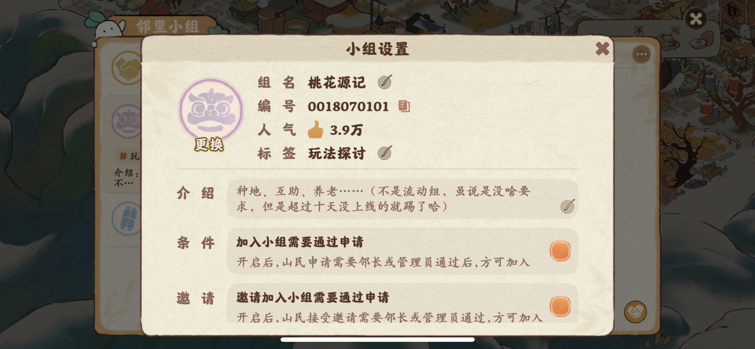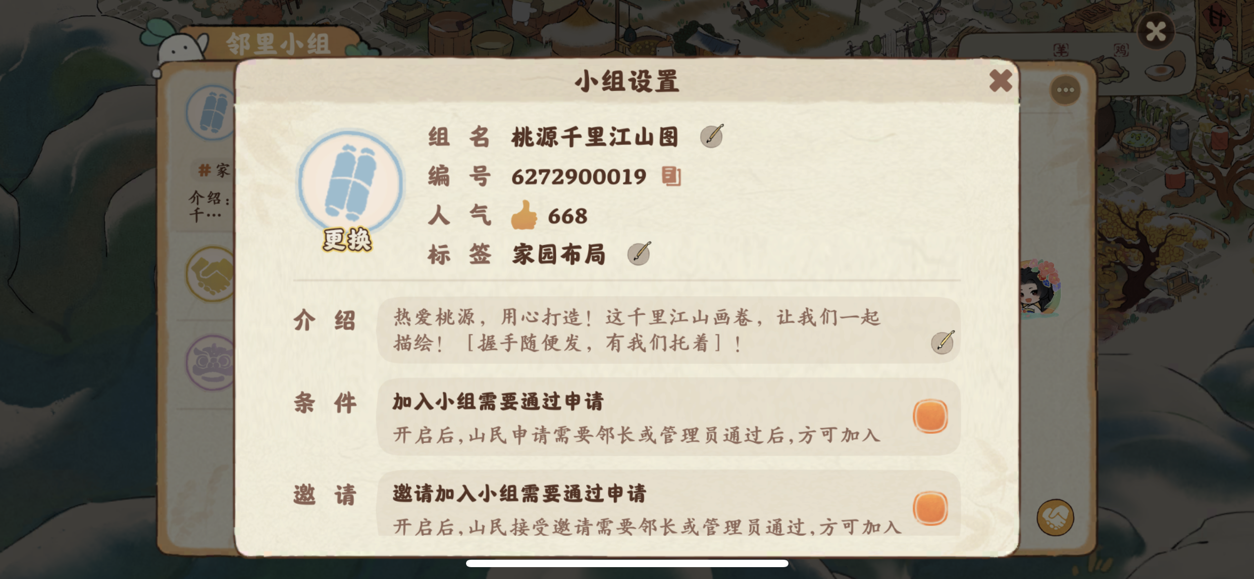 司马丶韭菜和公孙丶茭白两位满级满经验开服老玩家又组建了一个新的小组《桃源千里江山图》✌︎˶╹ꇴ╹˶✌︎。 我们手里已经各有1个满人小组,现在又共同创建了一个新的小组(ˊo̴̶̷̤ ̫ o̴̶̷̤ˋ),立意给萌新朋友们提供互帮互助的平台、给佛系养老的玩家们领退休金的去处! 没啥要求,每天冒冒泡、握握手、聊聊天。新人、老人、达人随便来!前期我们两个的资源就可以满足你们٩(๛ ˘ ³˘)۶♥!来吧来