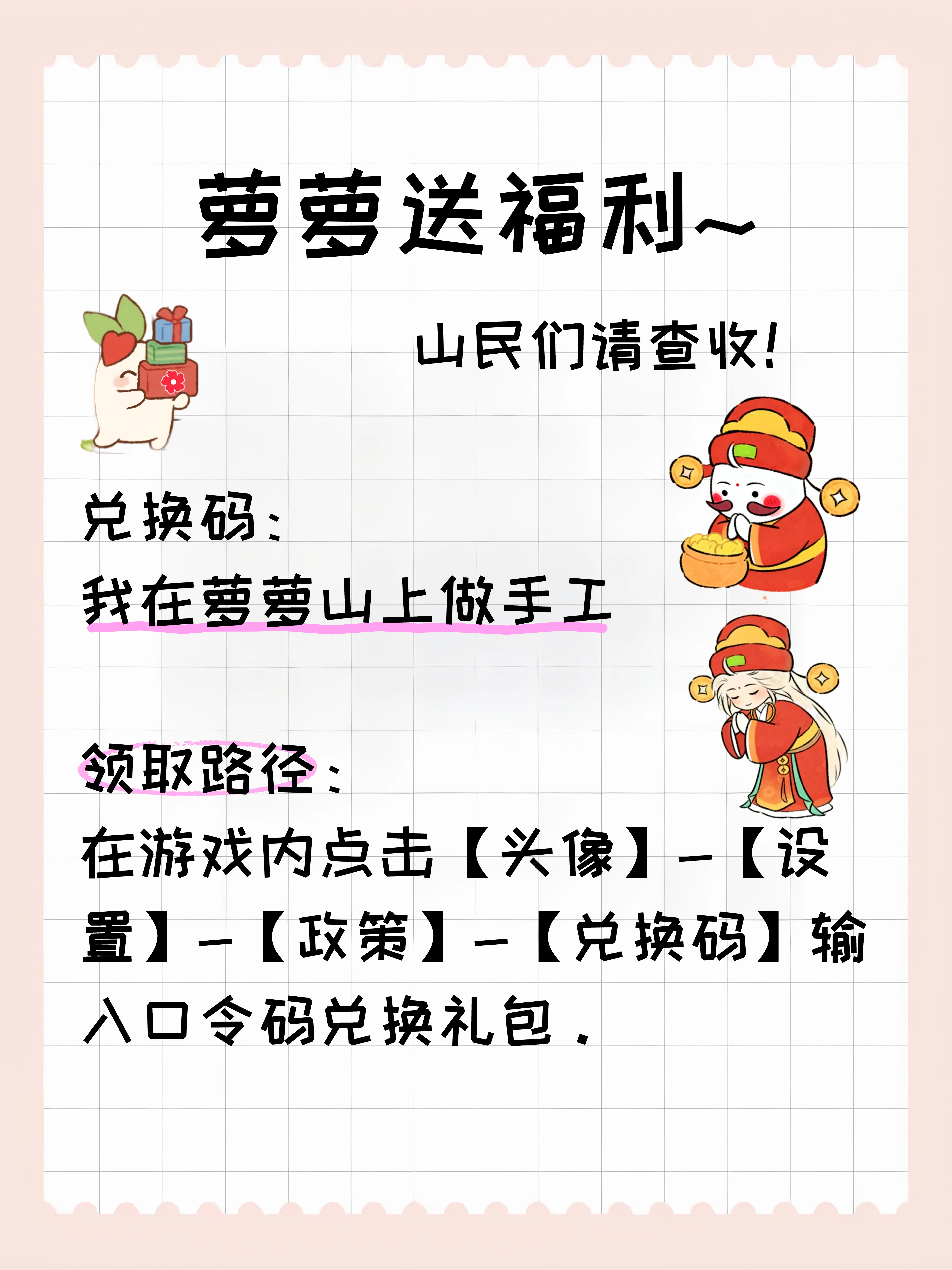 口令码:我在萝萝山上做手工领取方式:在游戏内点击【头像】-【设置】-【政策】-【兑换码】输入口令码兑换礼包。#桃源深处有人家 #桃源 #客服 #发现好游戏 #休闲游戏