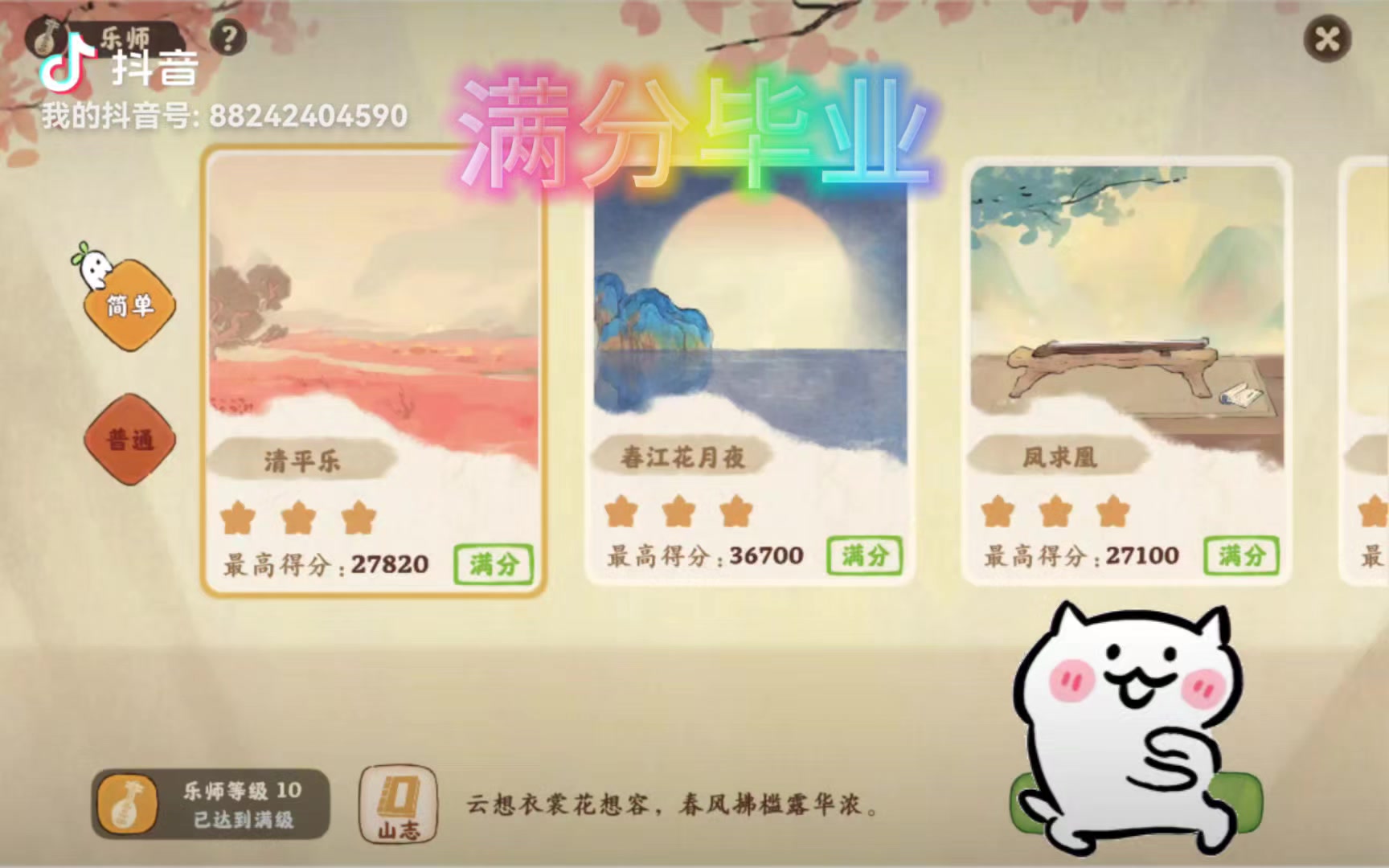 攒了好久终于把琴谱都买齐了 一口气把最后三首都过了 这个玩法是游戏里最吸引我的 虽然经常看到有玩家吐槽难度太大 但是作为很喜欢音游的我来说 是一个不错的挑战 要是可以随意调节倍速和音键位置就好了 音乐节奏太慢 导致打惯某音游三四倍速的我一开始不太适应 每次都要弹个一两次才能习惯节奏 最后希望官方可以再出一些新曲子 或者多出一些音游相关的活动#桃源深处有人家#桃源深处有人家攻略#游戏安利#游戏推荐#游戏讨论