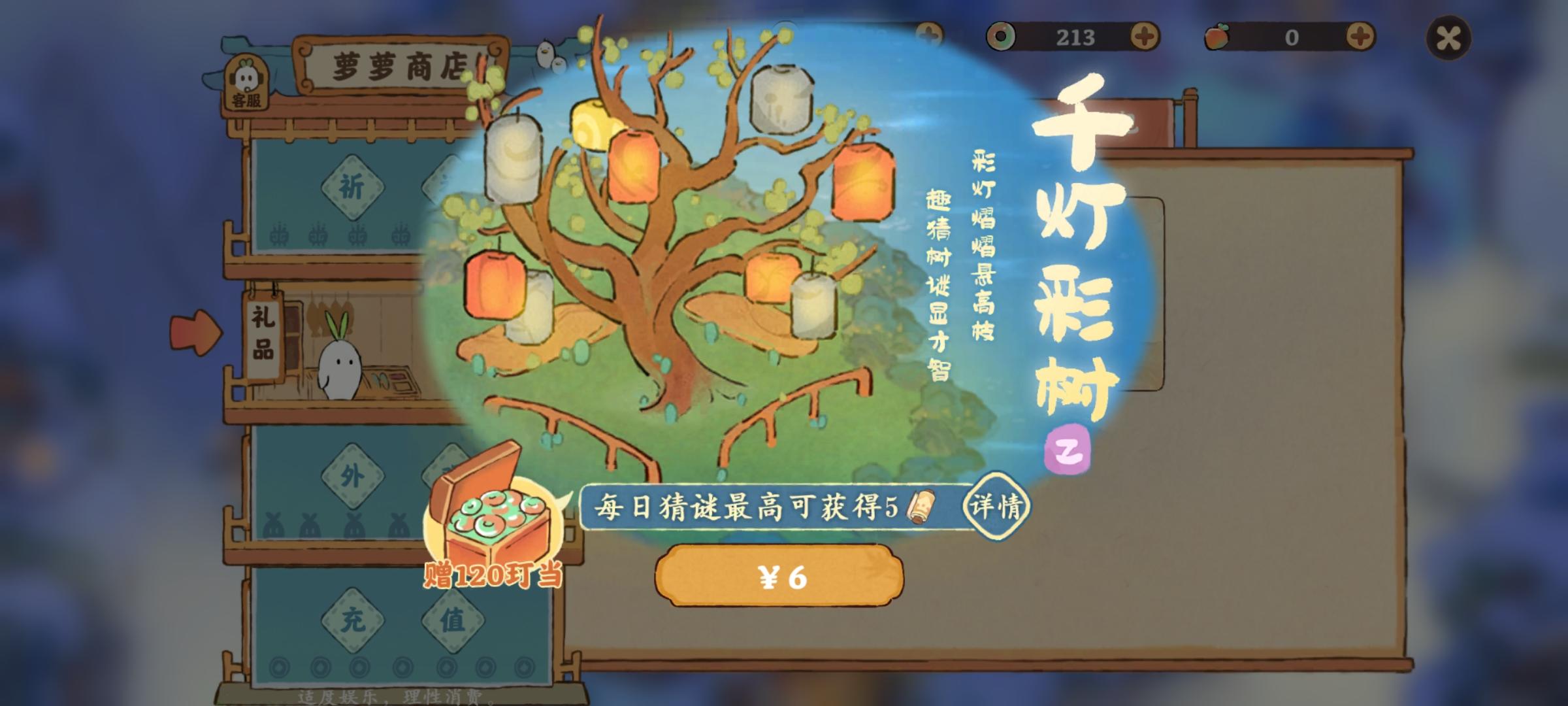 千灯彩树建筑,需要商店六元购买众所周知,或者说大部分山民所知,千灯彩树的答案是轮着来的。整理了整个二月份的答案。重点在这里☞一定要看题目和答案对不对应哦!!!!!!!!!#桃源深处有人家 #桃源深处有人家攻略 #千灯彩树 #千灯彩树答案